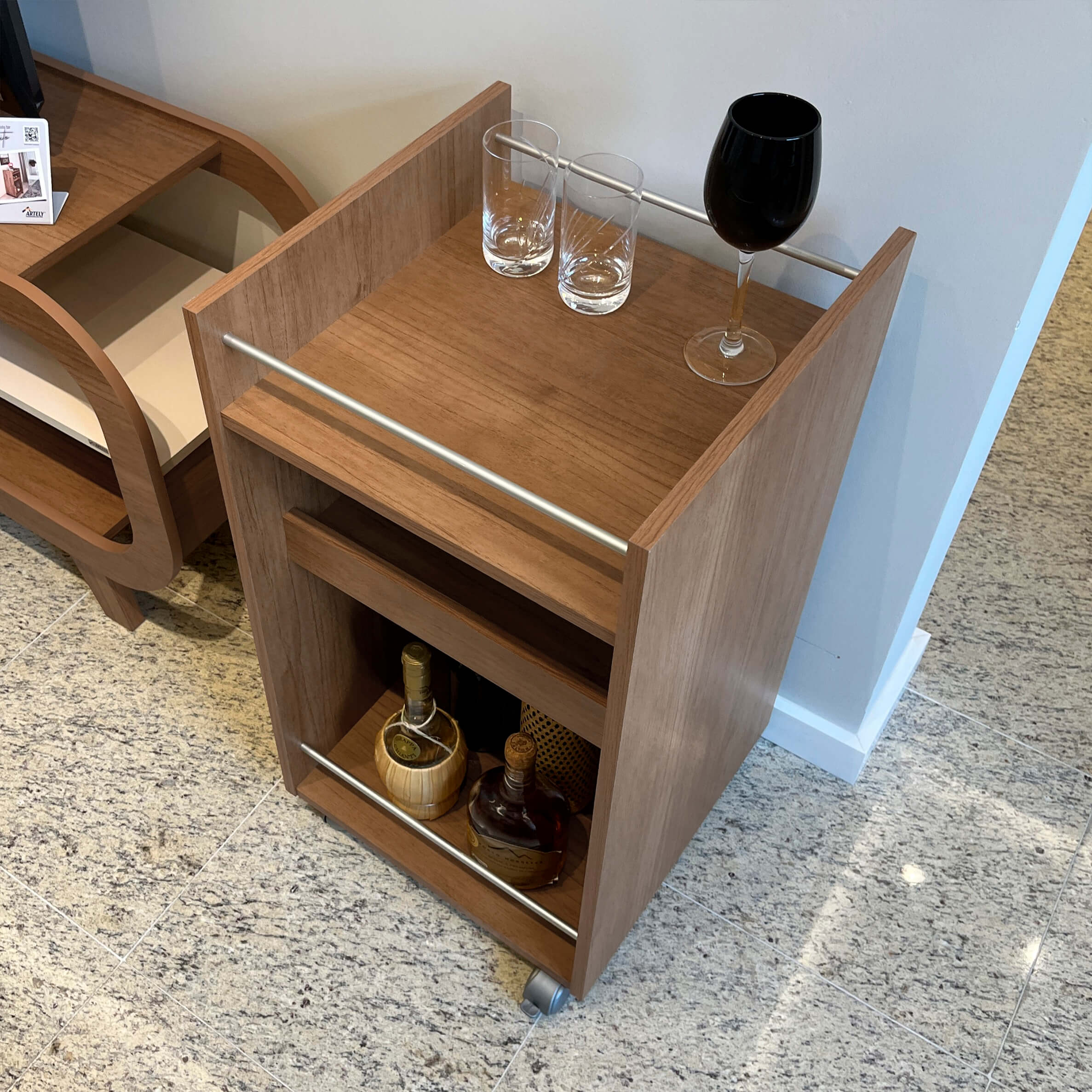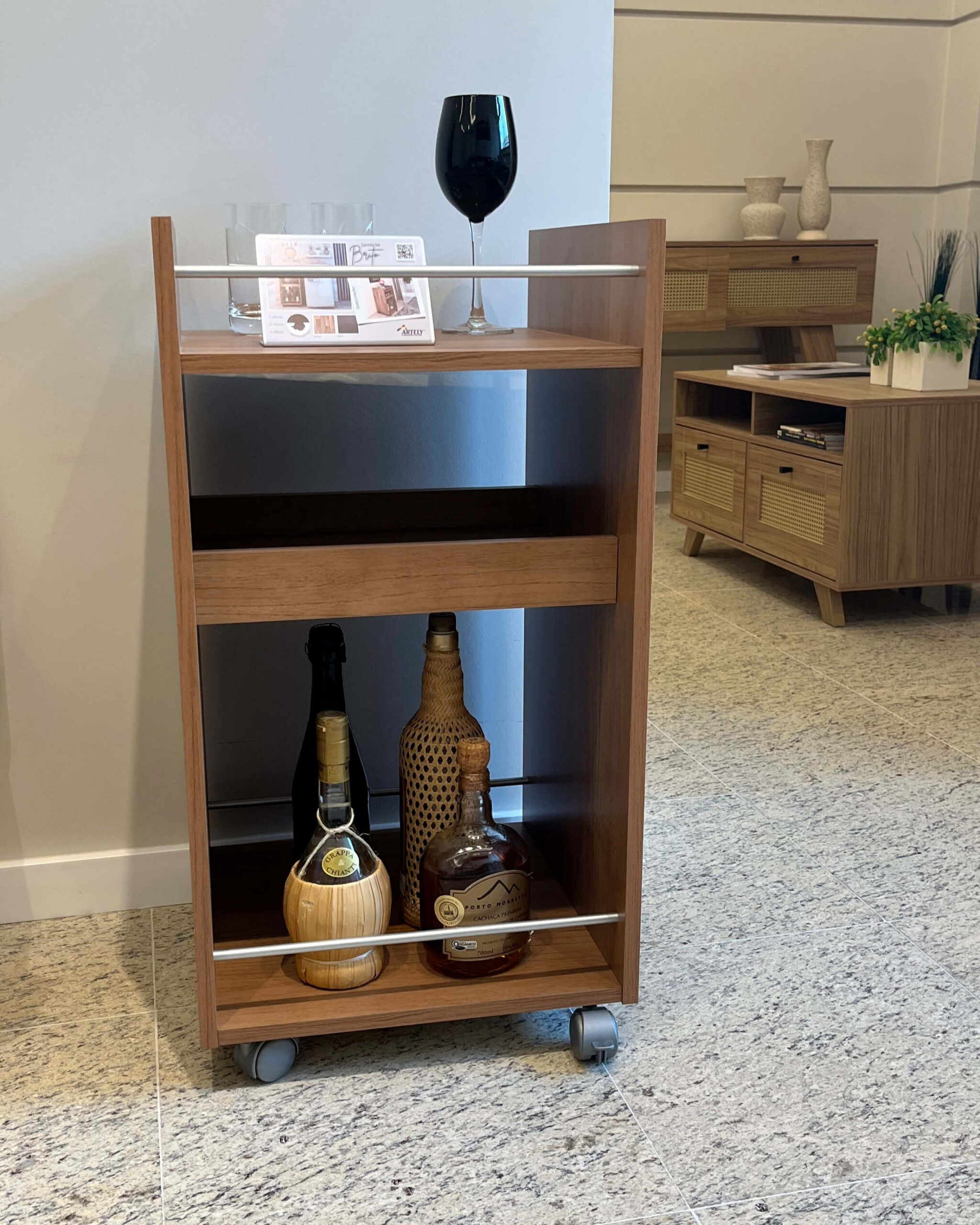 Deixe sua casa muito mais agradável e prática com o belo Carrinho Bar Brito! Suas prateleiras são ideais para organizar copos, taças e suas melhores garrafas. Os rodízios são muito práticos para servir as bebidas de forma elegante e personalizada, e podem ser travados a qualquer momento! Além de ser um item que traz praticidade na hora de preparar drinks e servir visitas, este bar é muito estiloso e deixa sua casa única e aconchegante!