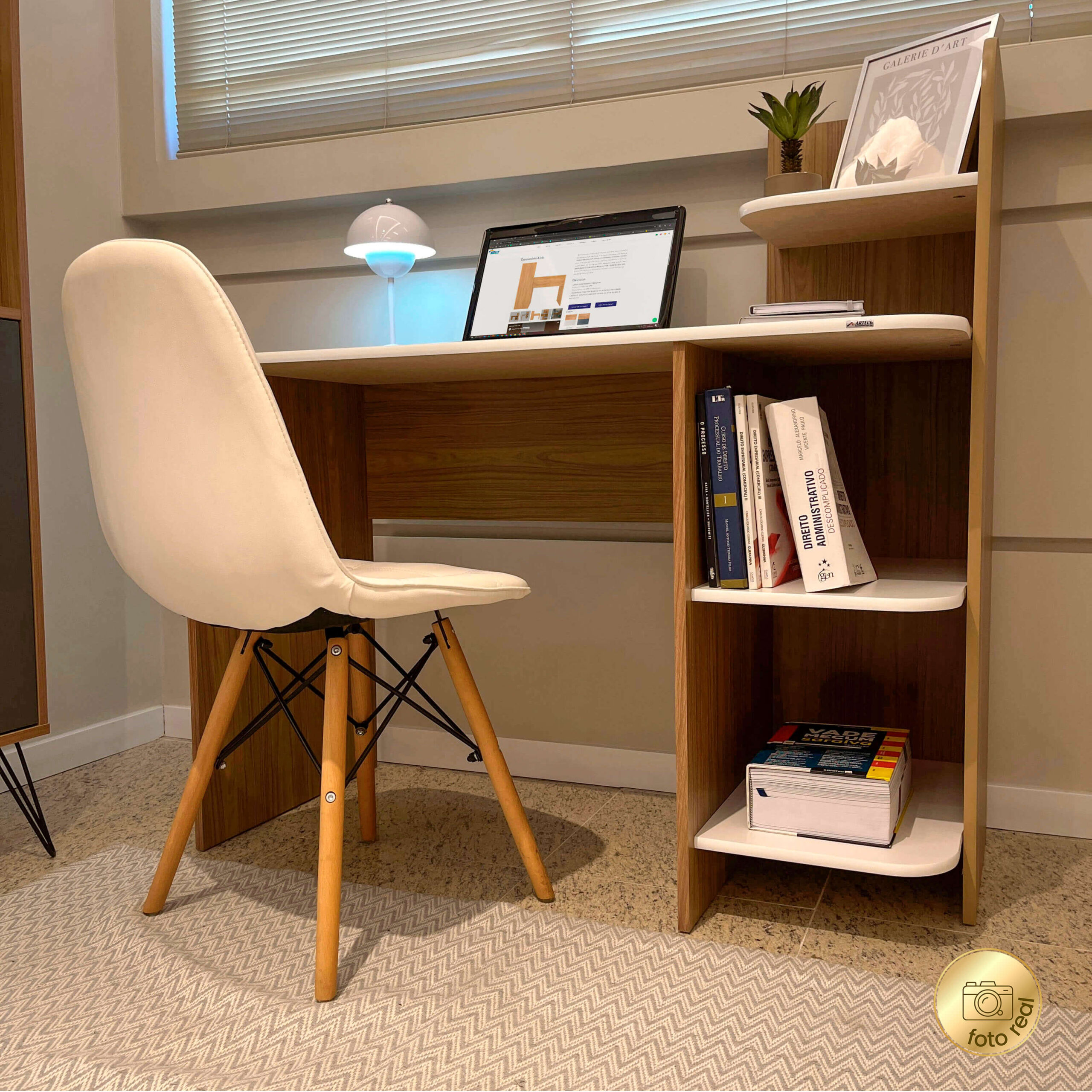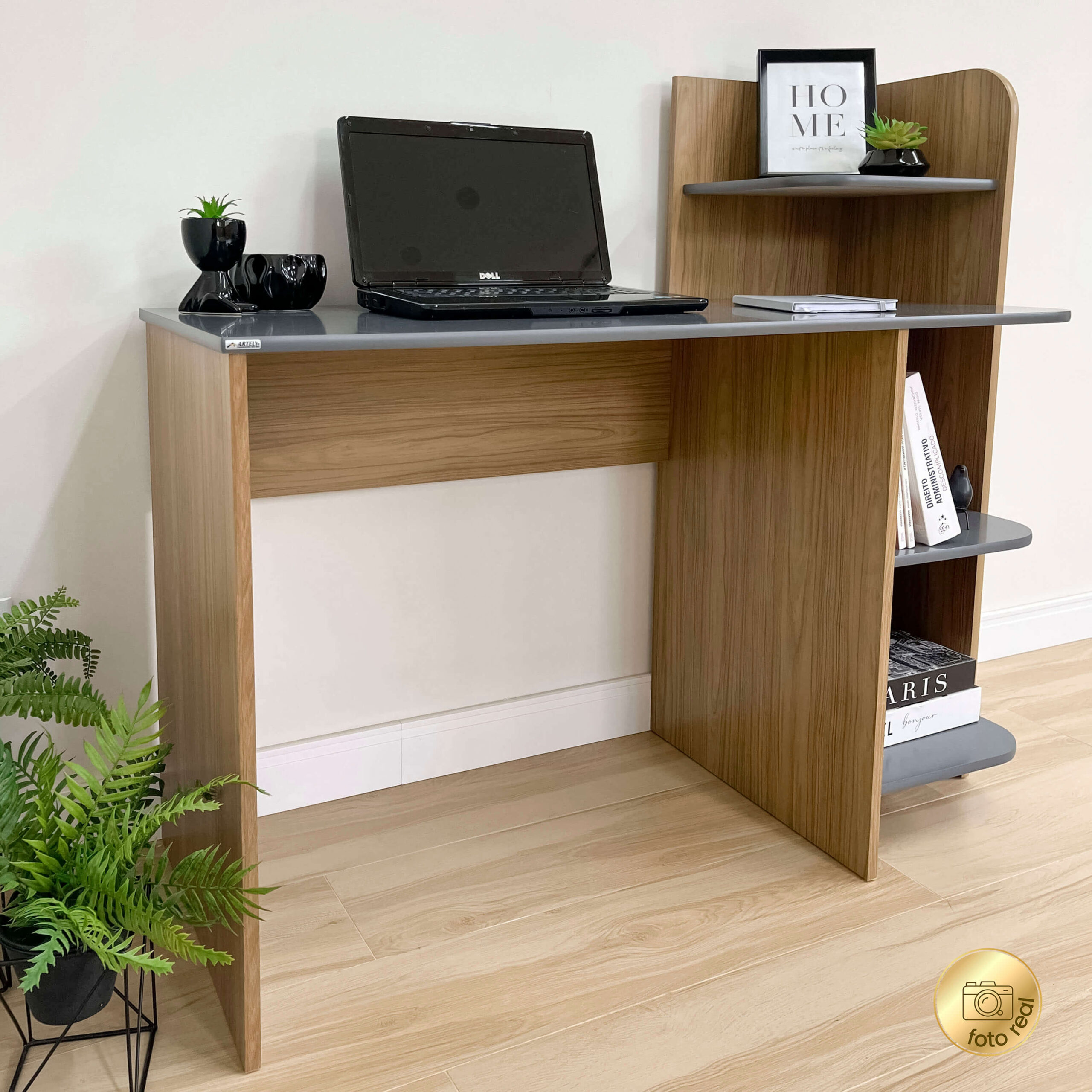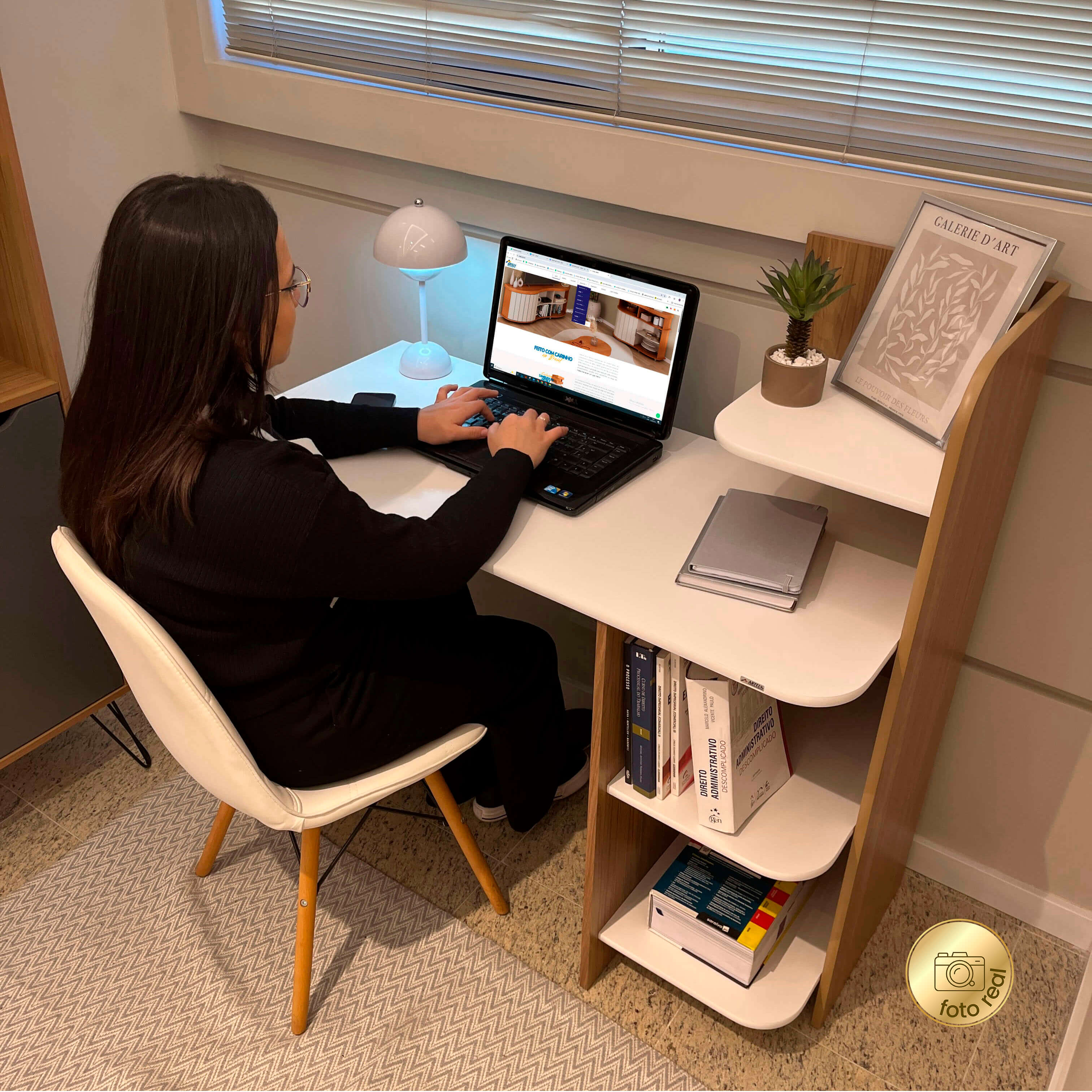 O tampo amplo acomoda com conforto computador ou notebook, além de materiais de apoio, garantindo praticidade no dia a dia. Tudo isso sem abrir mão do charme e da modernidade de um design único, que valoriza o ambiente e torna sua rotina mais funcional e inspiradora.