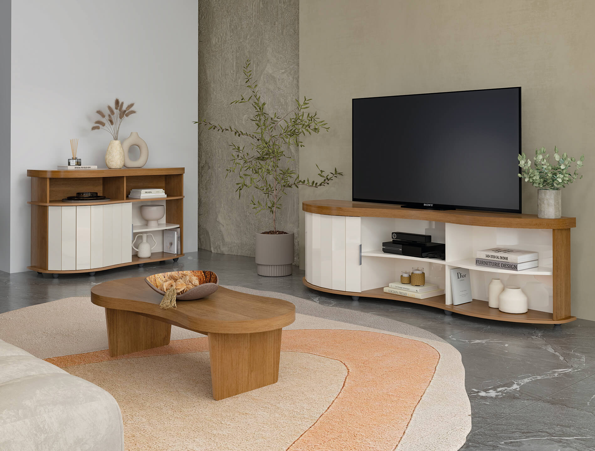 A Mesa de Centro Magnum traz um design único, inspirado nas formas orgânicas da natureza, com linhas suaves e curvilíneas que evocam fluidez e movimento. Ela adiciona um toque de requinte ao ambiente, criando uma atmosfera relaxante e convidativa.