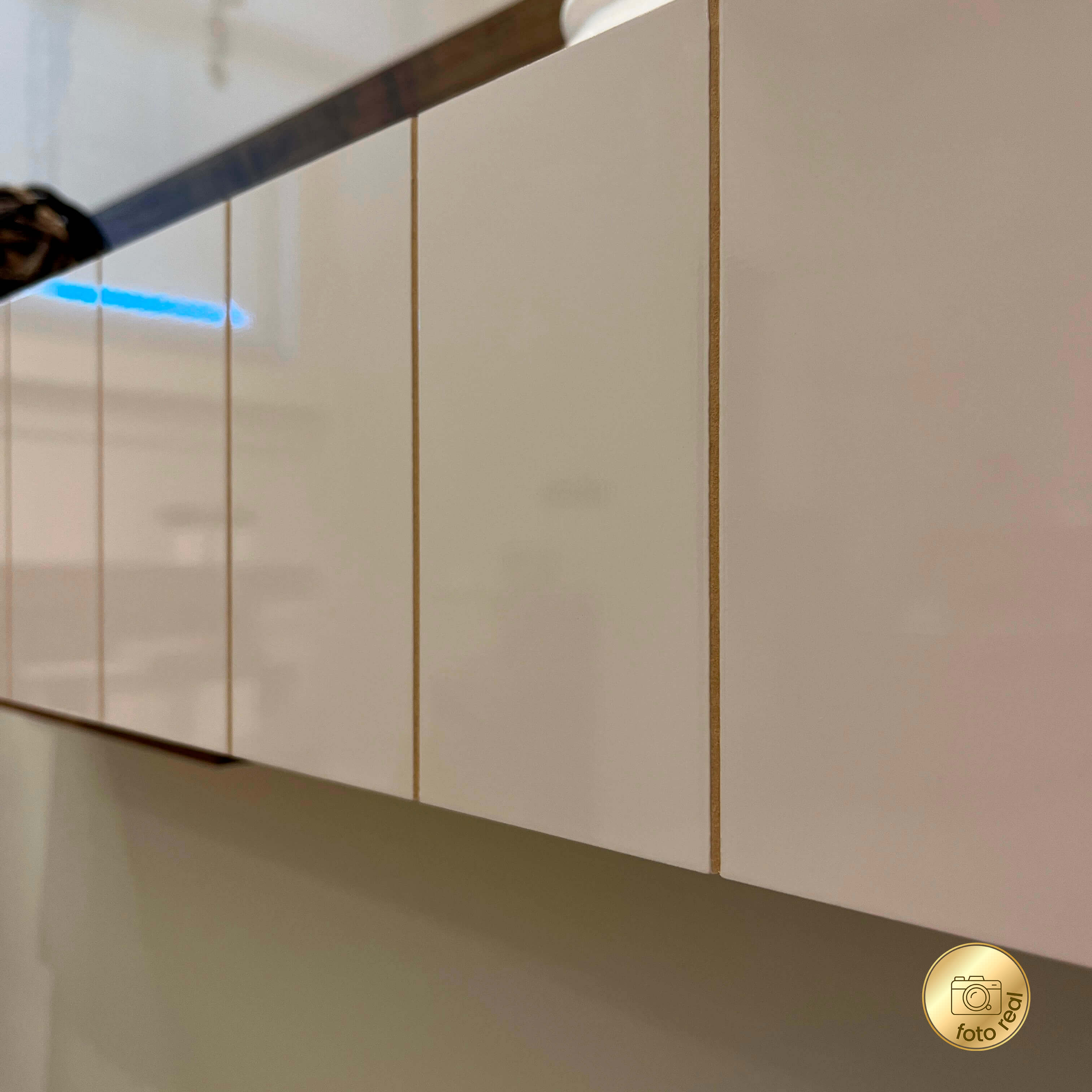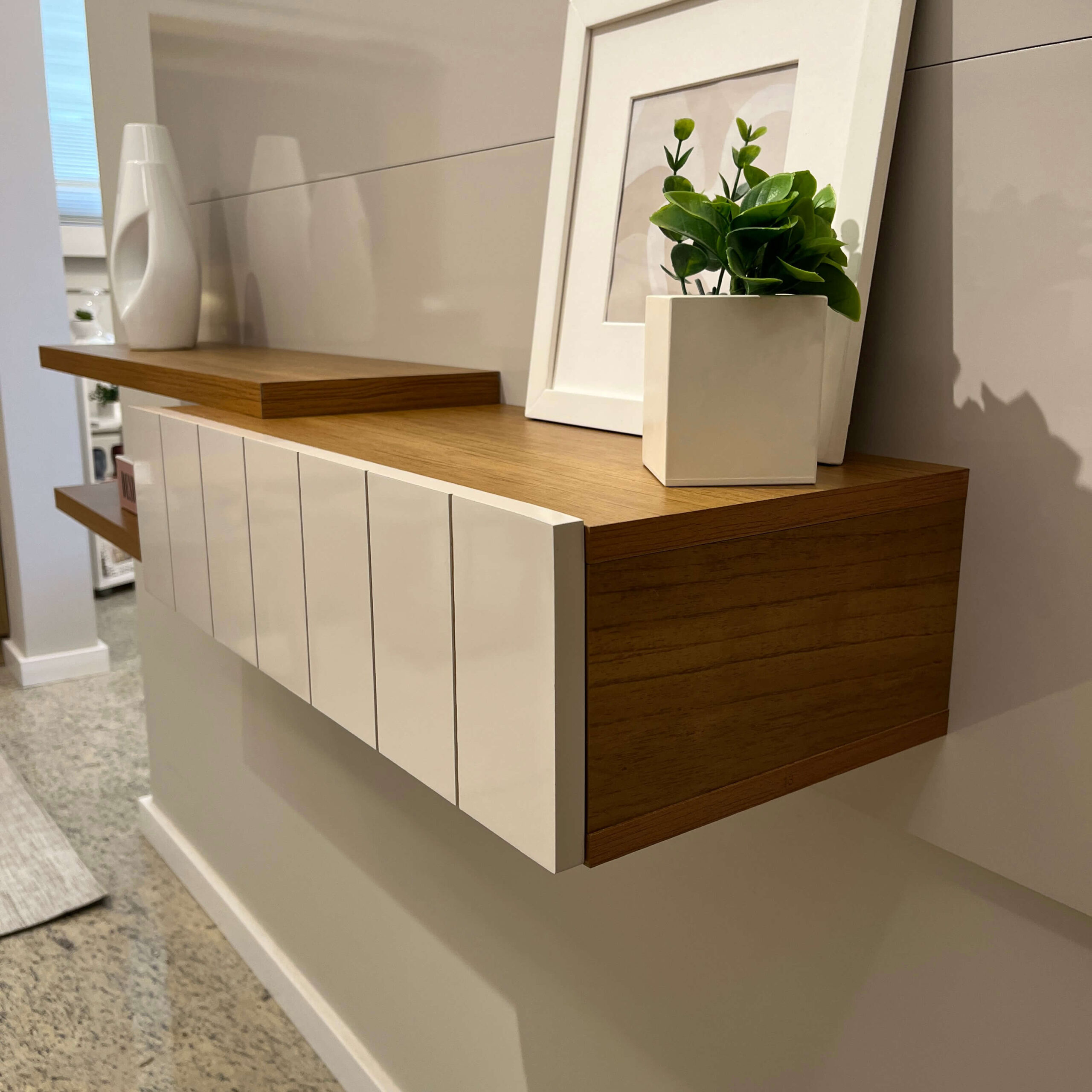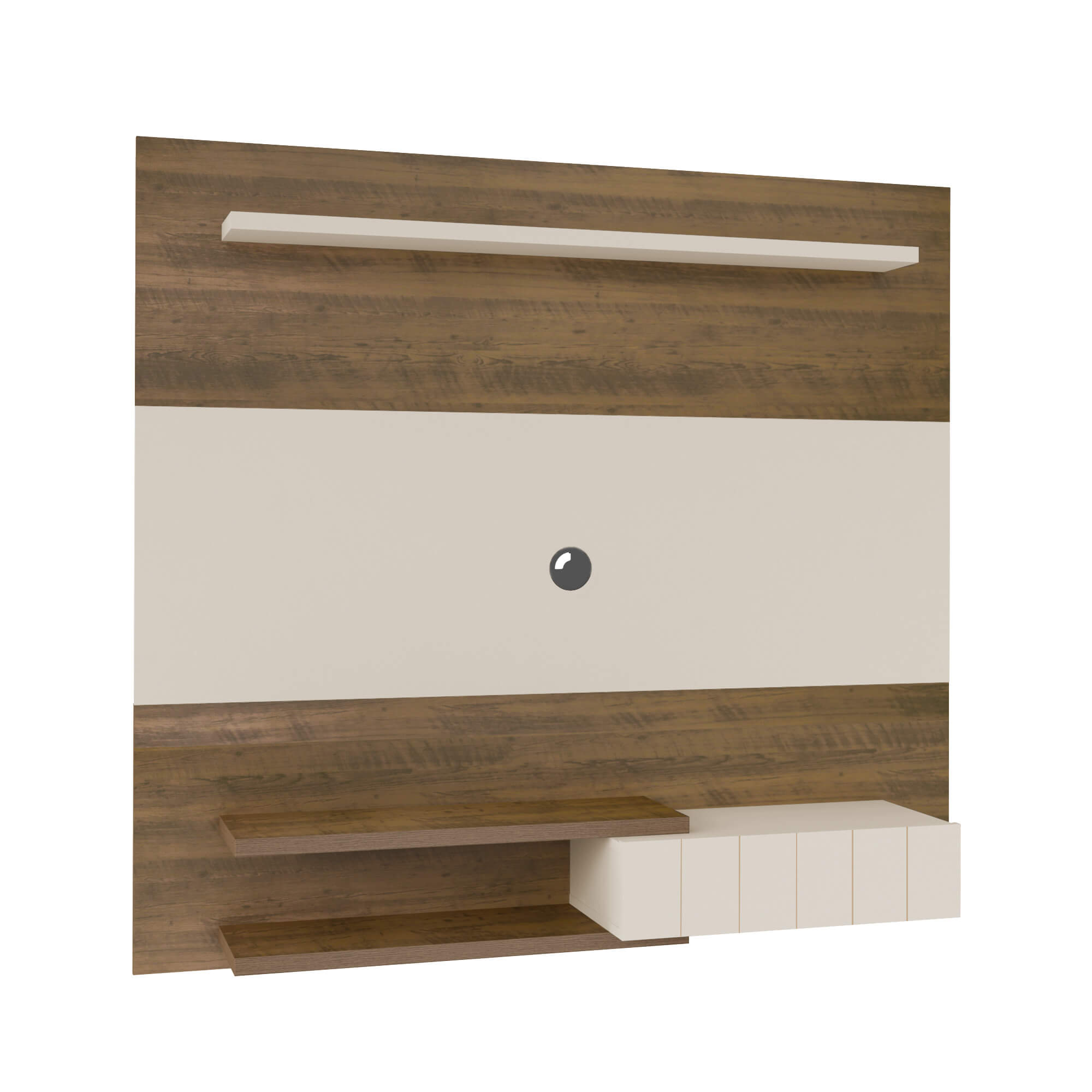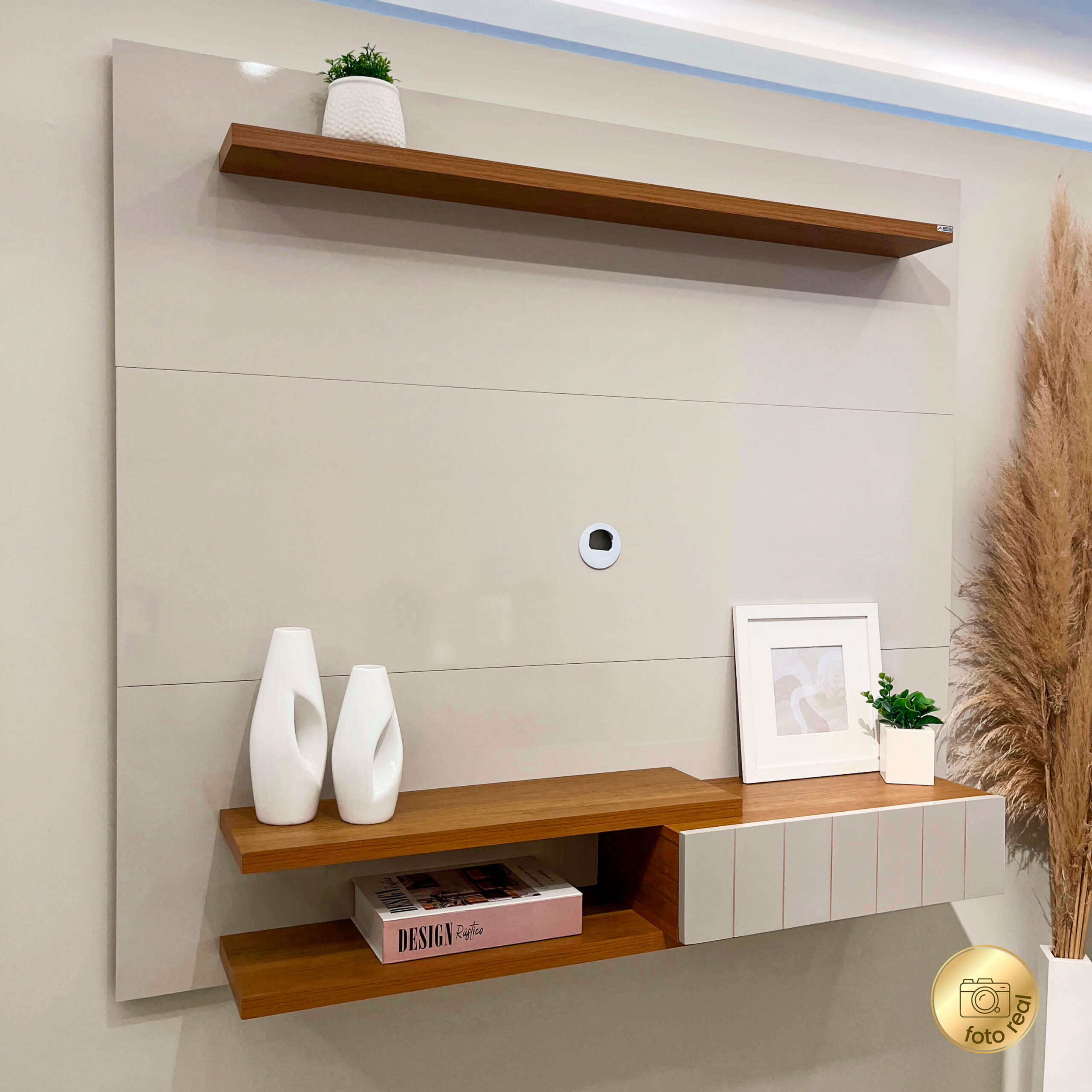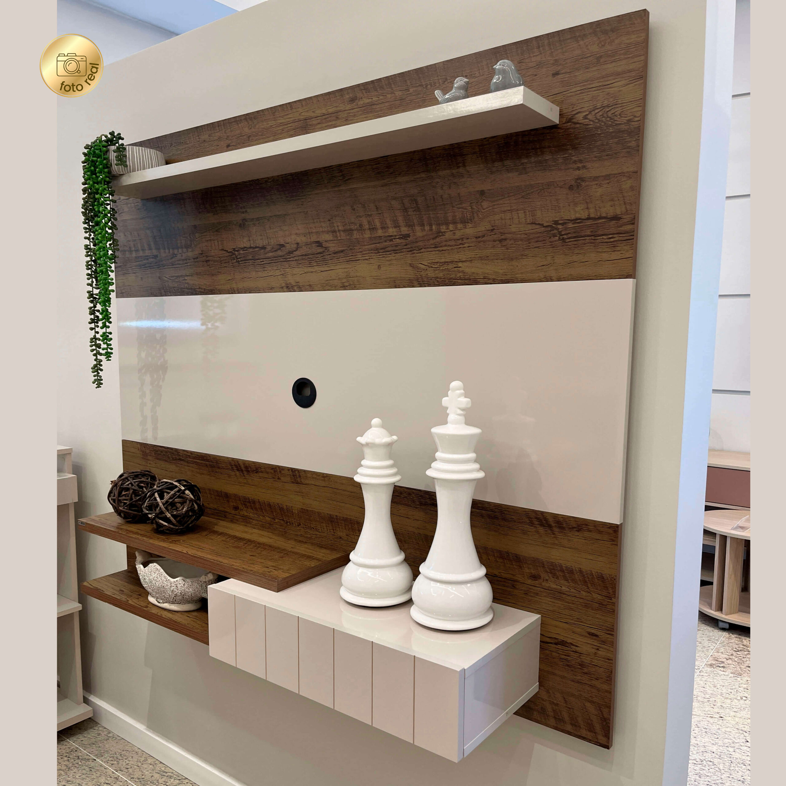 • O acabamento madeirado do móvel é feito em pintura UV texturizada, e o Off White é feito em pintura UV alto brilho, ambos de longa durabilidade e fácil limpeza.