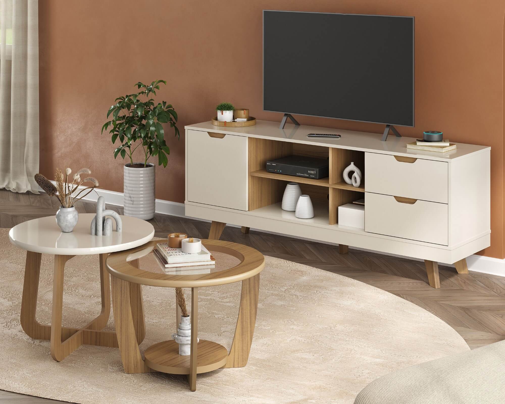 Encante-se com o elegante Rack Michigan, a peça-chave da organização e decoração da sua sala! Ele é perfeito para trazer a sofisticação e leveza que a sua casa merece, pois possui traços leves e design clean. Sua harmônica combinação de cores entre o amadeirado e o suave Off White tornam o móvel delicado e elegante. Comporta com segurança sua TV e todos os equipamentos eletrônicos necessários, além de oferecer muito espaço interno para armazenamento. Você vai amar a elegância e funcionalidade deste produto Artely!