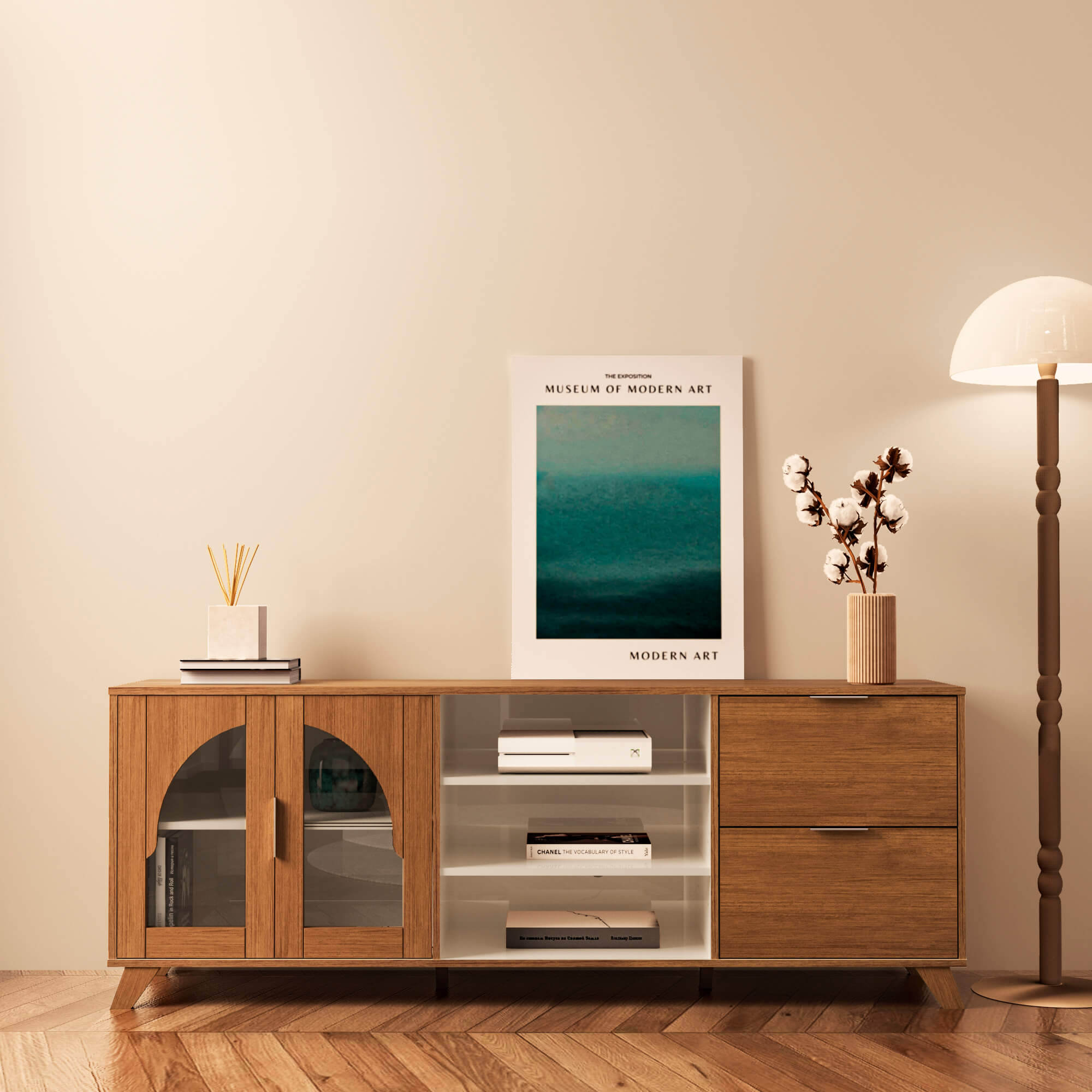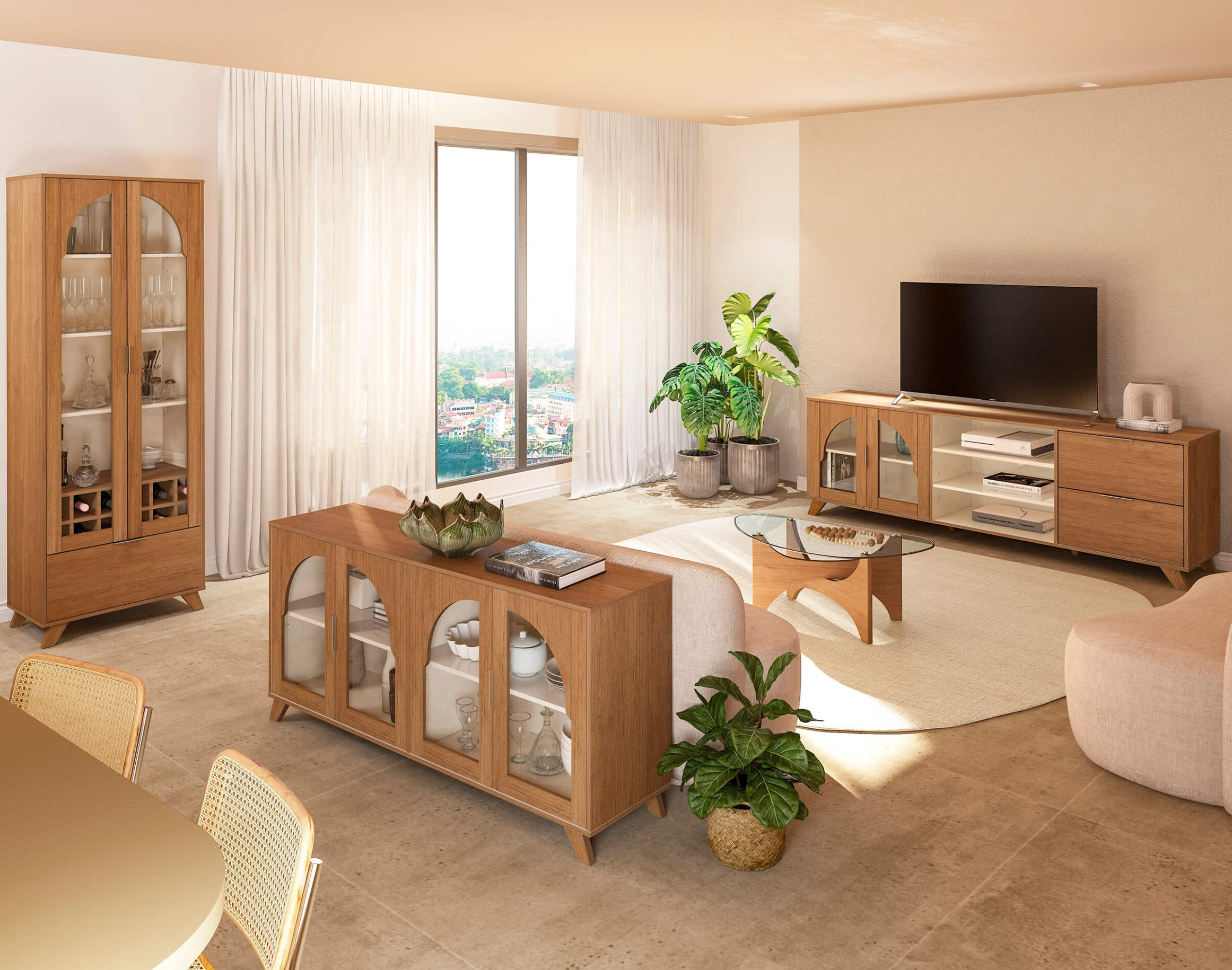 As portas de vidro temperado, com desenho arredondado, funcionam como vitrines sutis: protegem, revelam e embelezam. Os nichos abertos criam ritmo e respiro visual, enquanto as gavetas de fechamento suave completam a composição com funcionalidade e conforto no uso diário.